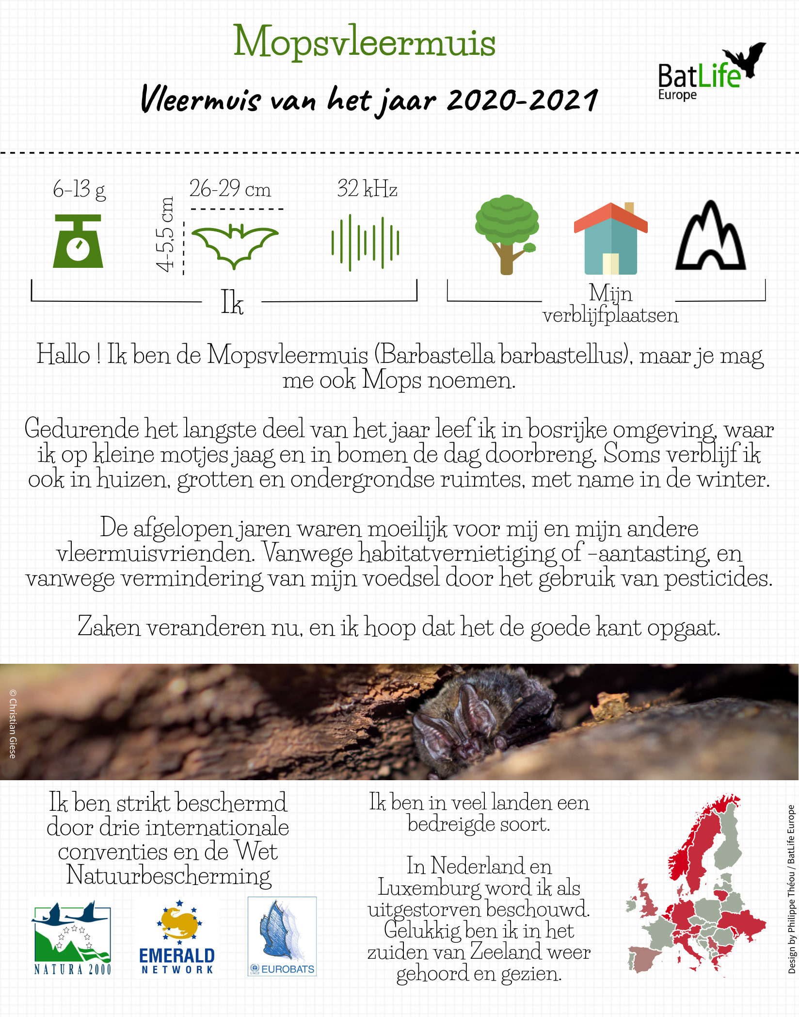 BatLife Europe, een koepelorganisatie voor de bescherming van vleermuizen, roept de mopsvleermuis uit tot de "Europese Vleermuis van het Jaar 2020-2021". De mopsvleermuis geeft menig Nederlandse vleermuisliefhebber “vlinders in de buik”. Na officieel uit Nederland te zijn “verdwenen” zijn er recent weer enkele waarnemingen in Nederland gedaan. Een vleermuis die dus wat extra aandacht verdient!