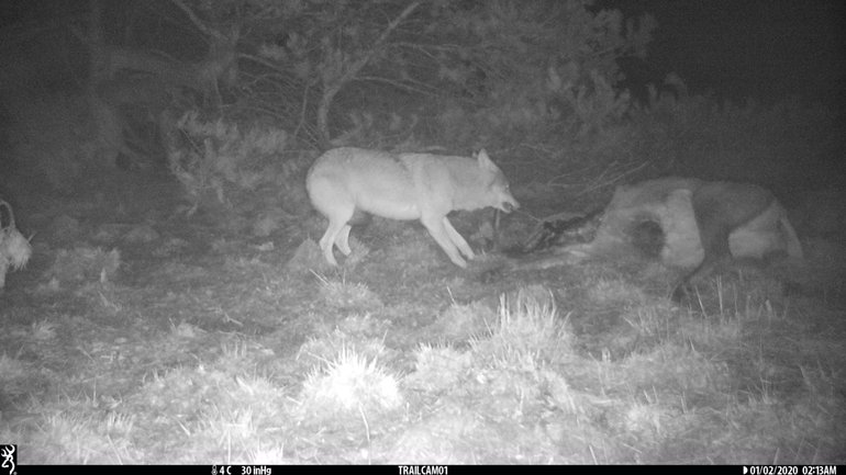 In augustus vorig jaar werd al zichtbaar hoe de dynamiek tussen aaseters kan veranderen, toen een wolf werd waargenomen bij de restanten van een dood edelhert. Onze cameravallen legden de eerste dagen van dit jaar iets vergelijkbaars vast op een andere locatie.