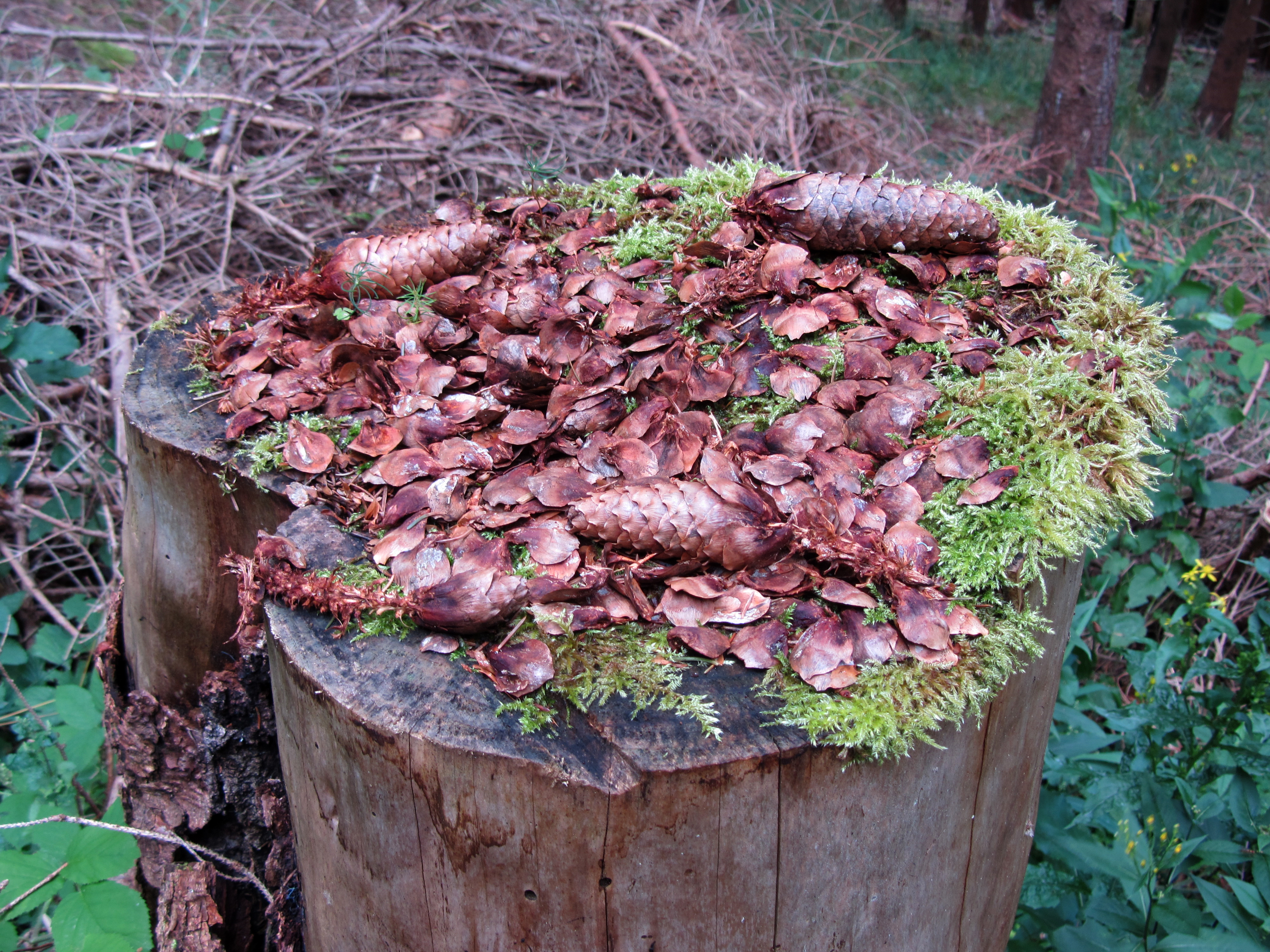In de bossen waar het lastig is om de eekhoorns zelf te zien, kun je door gericht te zoeken wel het hele jaar door hun sporen vinden. Wanneer er dennen staan of fijnsparren, dan zijn de karakteristieke vraatsporen van eekhoorns onder die bomen te vinden. Ze zijn met enige kennis vrij eenvoudig te onderscheiden van vraatsporen door spechten of (woel)muizen. Spechten hakken de dennenappels open waardoor er een slordige maar wel complete dennenappel achterblijft. Eekhoorns en (woel)muizen knagen de schubben weg om bij de zaden te komen. De eekhoorn gaat daarbij ‘slordiger’ te werk waardoor er rafels aan de as van de dennenappels en sparrenkegels blijven zitten.