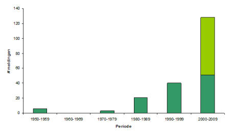 Oranje is het aantal meldingen uit 2009, het Jaar van de Egel.