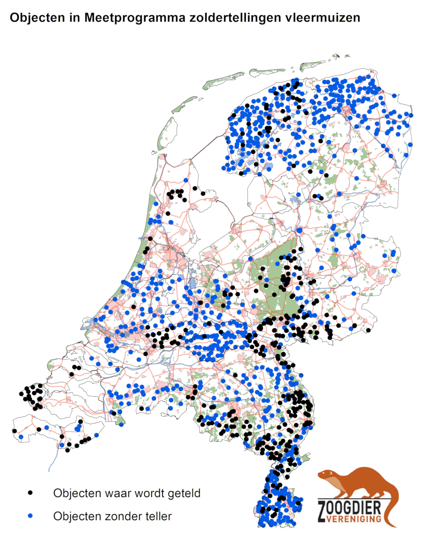 In het meetprogramma NEM Zoldertellingen geregisteerde objecten waar geteld worden en objecten zonder teller. (Bron: Zoogdiervereniging)