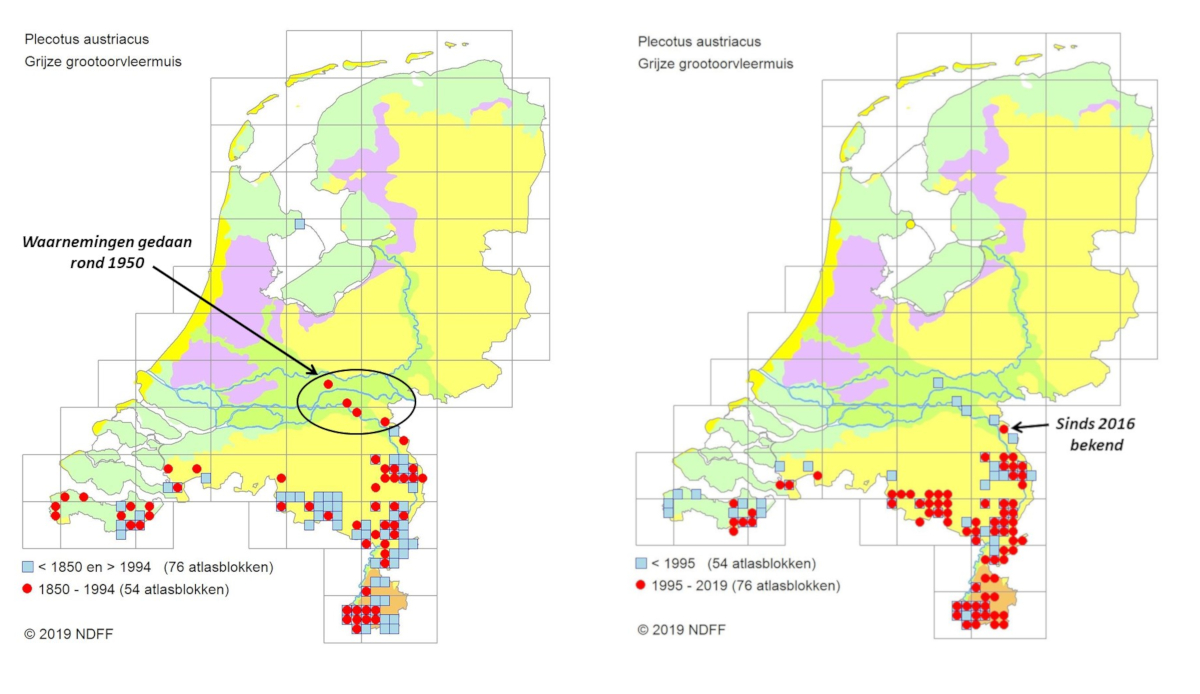 De grijze grootoorvleermuis is in Nederland een zeldzame vleermuis. We vinden haar momenteel in Limburg, Zuidelijk Noord-Brabant en Zeeuws-Vlaanderen. Dit vormt de noordelijke grens van haar verspreidingsgebied in Nederland.