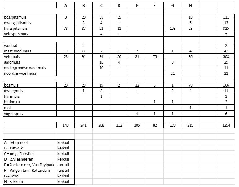 Tabel met geplozen prooisoorten (excl. nagekomen waterspitsmuis) (Bron: Nico Jonker en Kees Mostert).