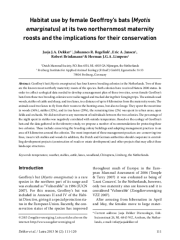 Geoffroy’s bat (Myotis emarginatus) has four known breeding colonies in the Netherlands. Two of these are the known most northerly maternity roosts of the species. Both colonies have received Natura 2000 status. In order to collect ecological data needed to develop a management plan of these two sites, seven female Geoffroy’s bats from these two breeding colonies were radio tagged and tracked during their foraging trips. The animals used woods, stables of cattle and sheep, and tree lanes, to a distance of up to 8 kilometres from the maternity roosts. The animals used tree lanes to fly from their roosts to the hunting areas, but also to forage. They spent the most time in woods (36%), stables (32%), and in tree lanes (29%), the remaining time (2%) was spent in urban areas, open fields and orchards. We did not observe any movement of individuals between the two colonies. The percentage of the night spent in stables was negatively correlated with outside temperature. Based on the ecology of Geoffroy’s bats and the data gathered in the telemetry study, we propose a number of recommendations for protecting these two colonies. These include conserving the breeding colony buildings and adapting management practices in an area of 8 kilometres around the colonies. The most important of these management practices are: conserving tree lines, insect-rich stables and woods In addition, the Dutch and German authorities should cooperate in controlling development projects (construction of roads or estate development) and other projects that may affect these landscape structures.