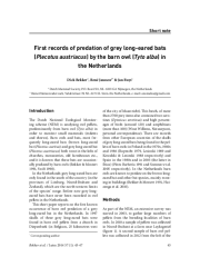 The Dutch National Ecological Monitoring scheme (NEM) is analysing owl pellets, predominantly from barn owl (Tyto alba) in order to monitor small mammals (rodents and shrews). Barn owls and bats, most frequently long-eared bats (brown long-eared bat (Plecotus auritus) and grey long-eared bat (Plecotus austriacus) both roost in the lofts of churches, monasteries, old farmhouses etc., and it is known that these bats are occasionally predated by barn owls (Bekker & Mostert 1991, Swift 1998). In the Netherlands grey long-eared bats are only found in the south of the country (in the provinces of Limburg, Noord-Brabant and Zeeland), which are the north-western limits of the species’ range. Before now grey longeared bats have never been recorded in owl pellets in the Netherlands. This short paper reports on the first known occurrence of barn owl predation of a grey long-eared bat in the Netherlands. In 1997....